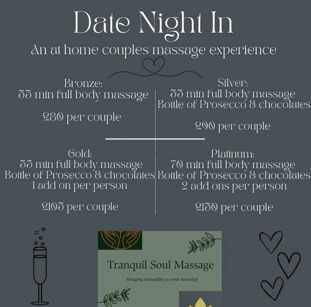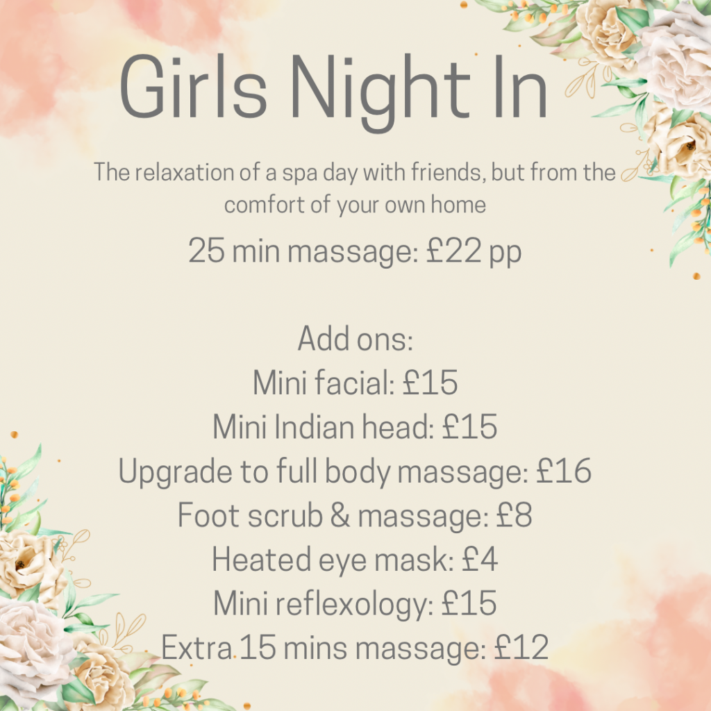 Our side business which we do together which includes at home pamper parties, couples massages, workplace wellness packages, zen parties, retreats- you name it! Have a look at some of our current offers but get in touch with any ideas you have!